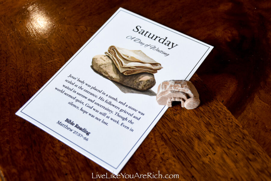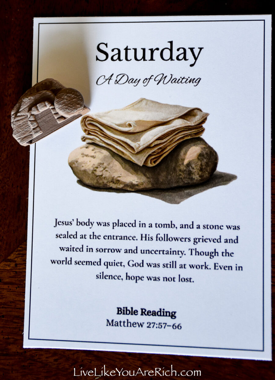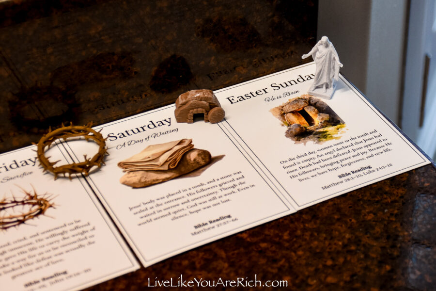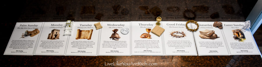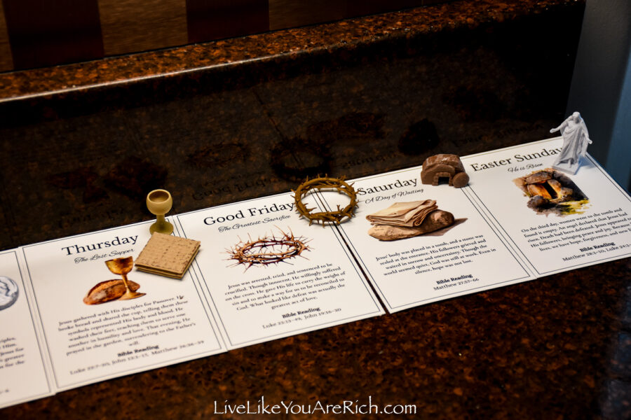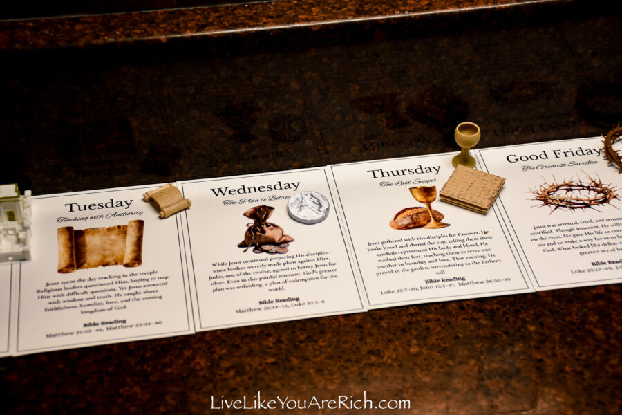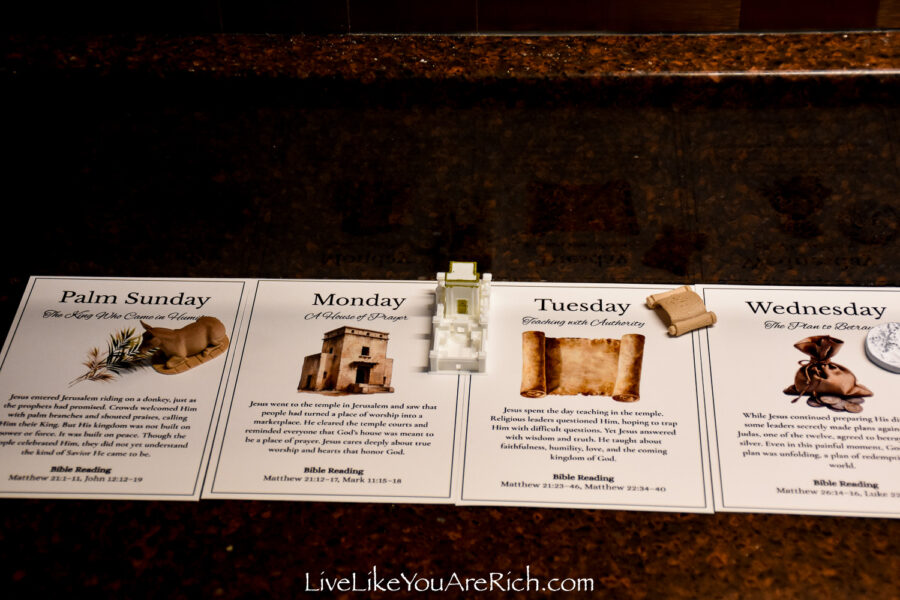 Our neighbor printed the cards off and cut them and we put them into a nice velvet bag for each child to be able to open and read each day of Holy Week leading up to Easter.