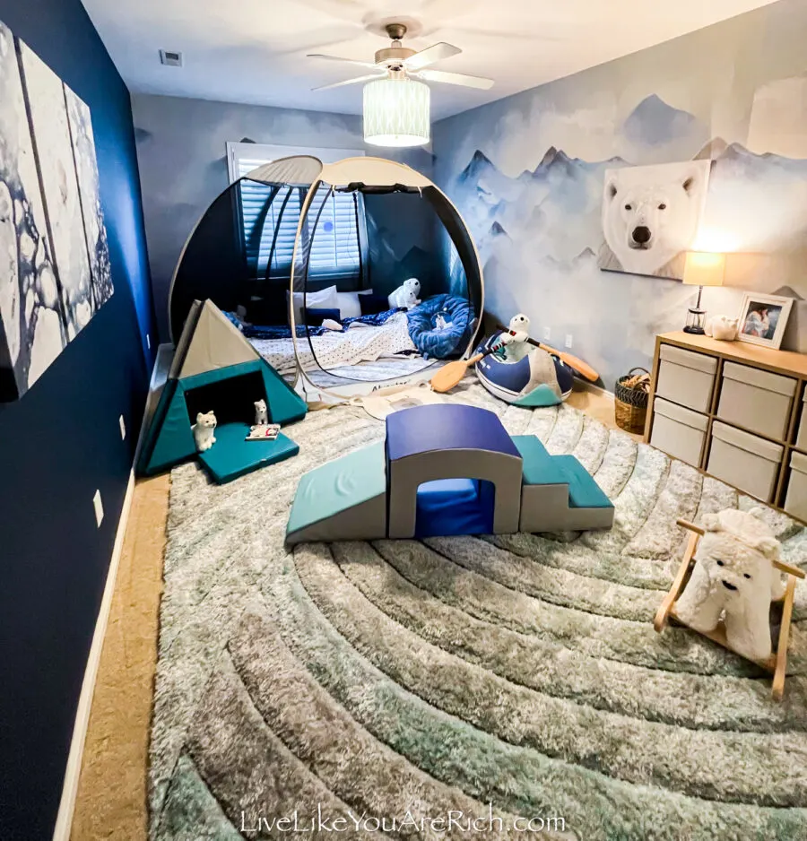 My son’s polar bear from his arctic bedroom came up to match the blanket.