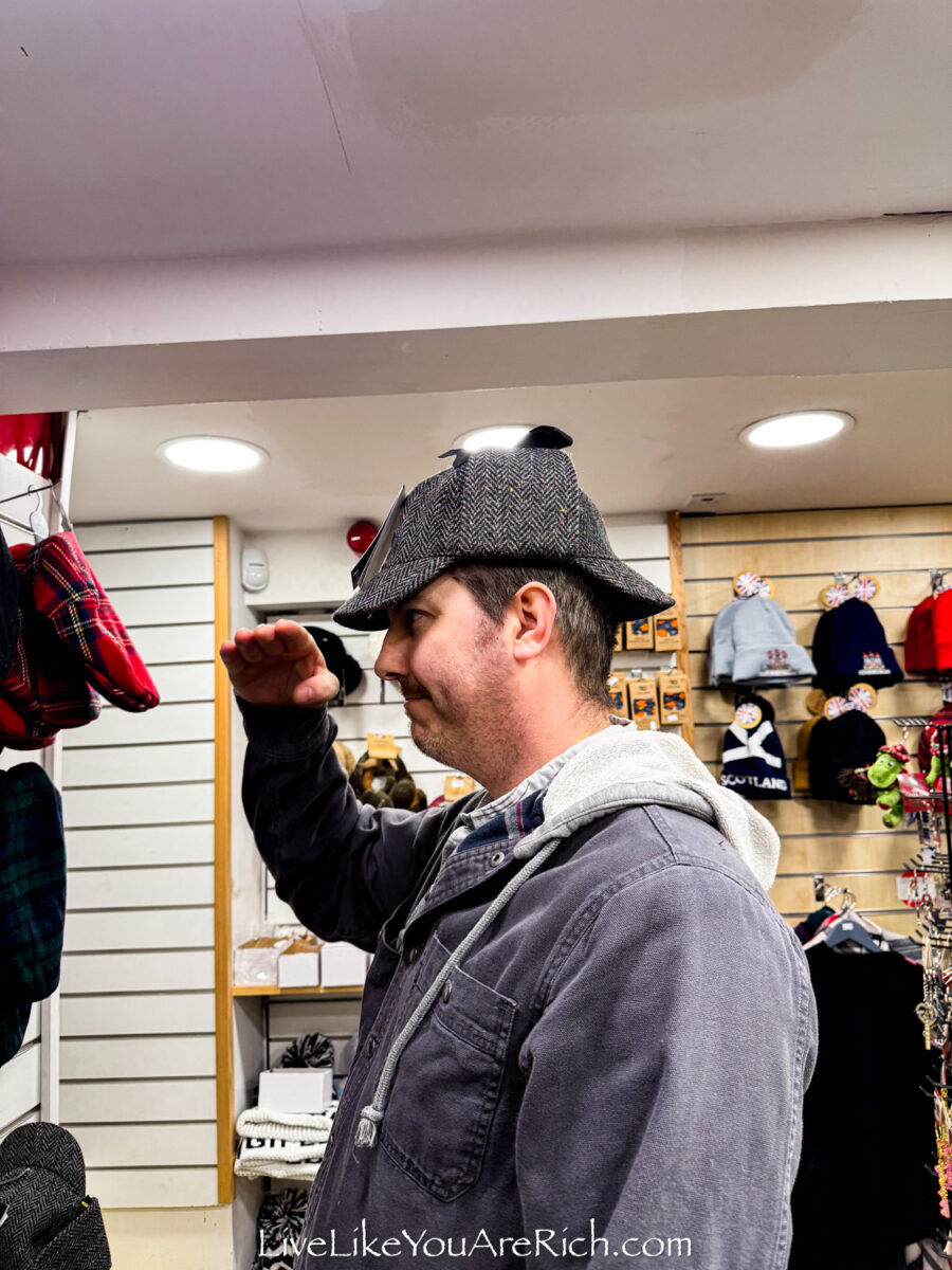 Toward the beginning of the trip Shane tried on different English and Scottish hats. A Sherlock hat.