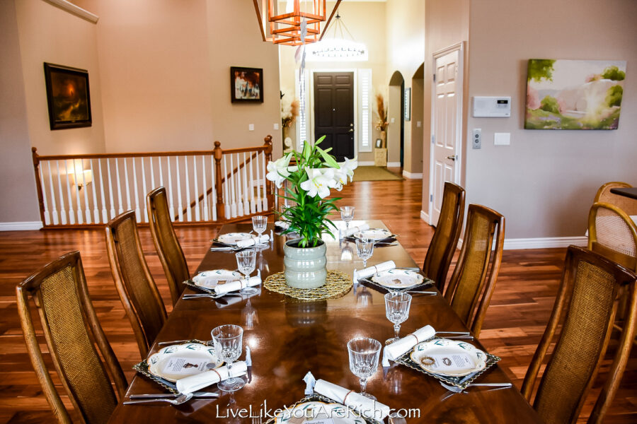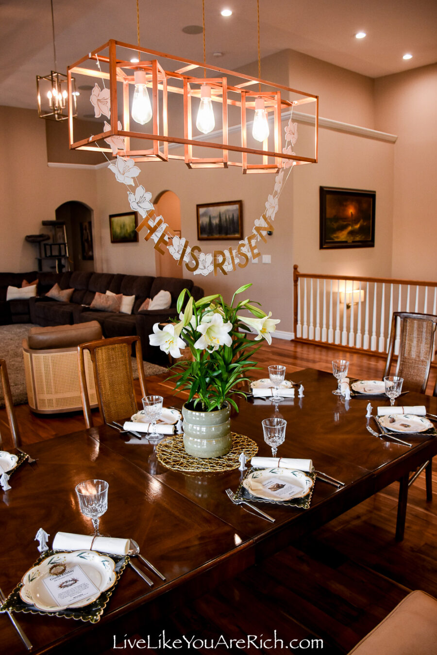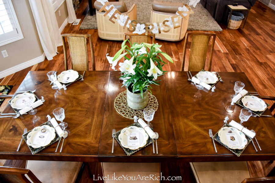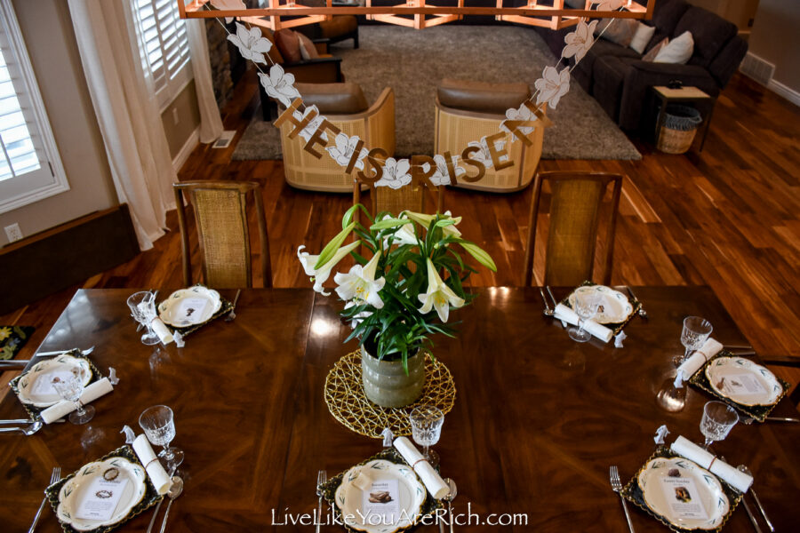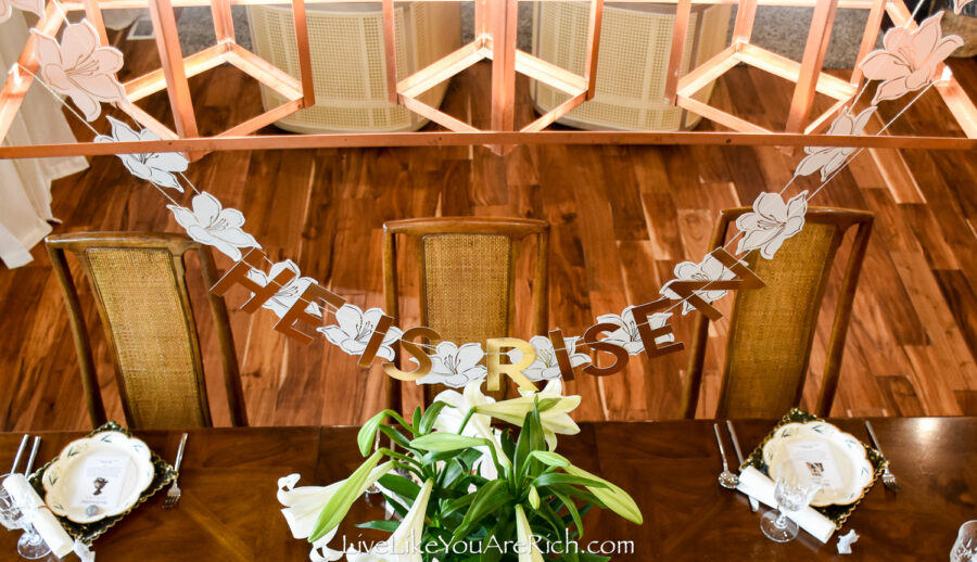Then I was gifted a pot of Easter lilies the other day and I thought it would be perfect to design an Easter tablescape using the flowers and the banner together.