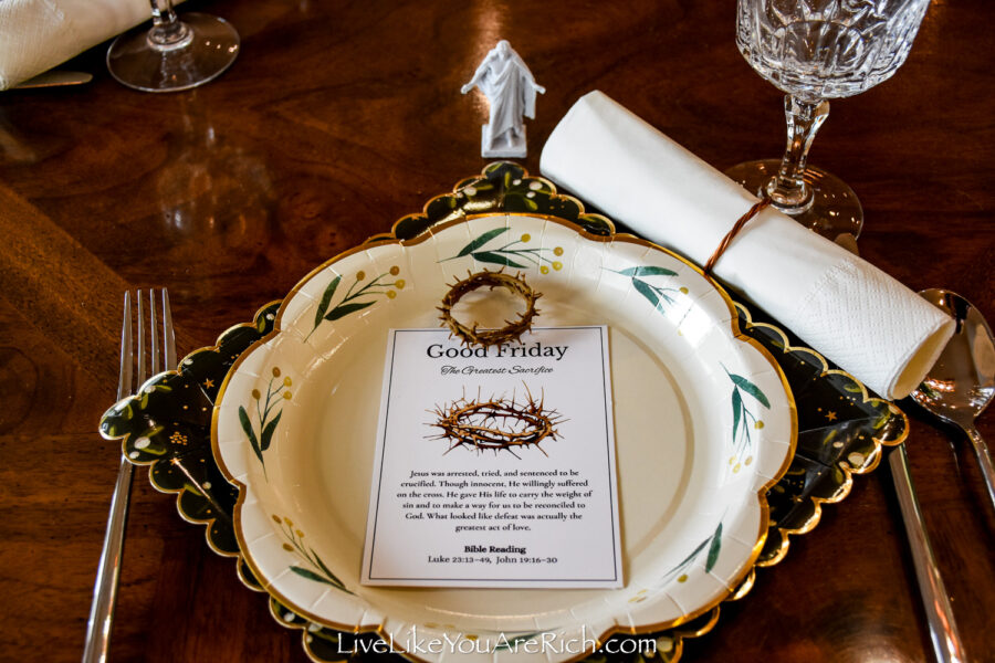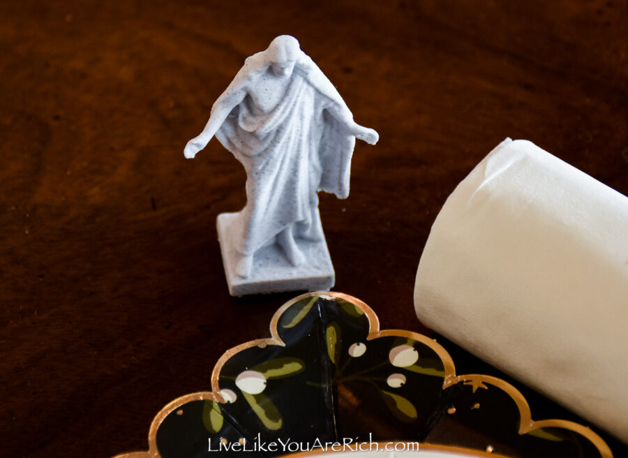 We printed 8 Christ miniature statues and I put those at the head of each setting to be given out as gifts.