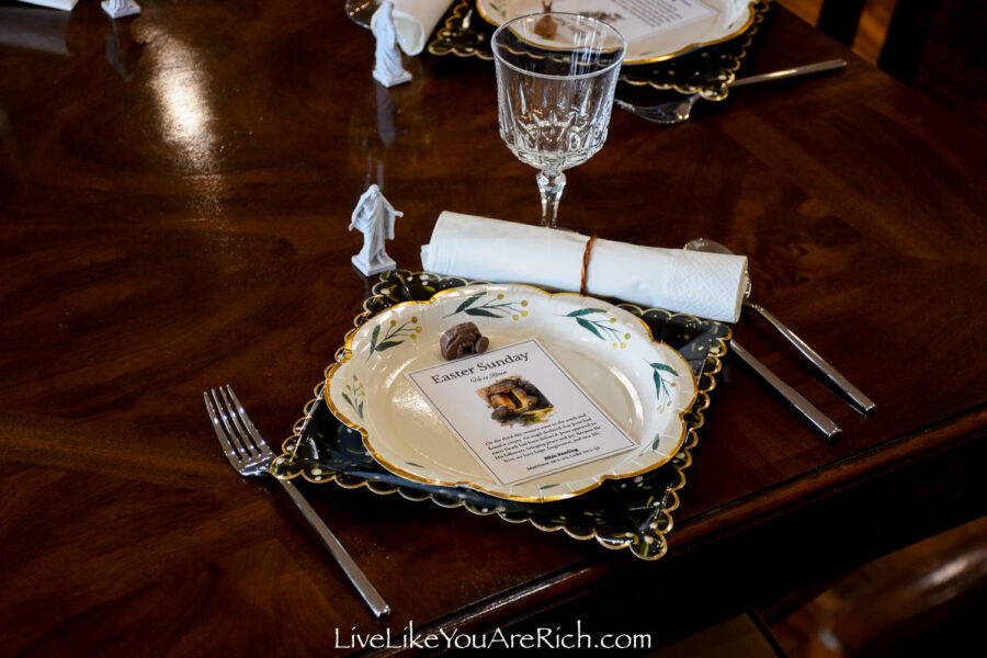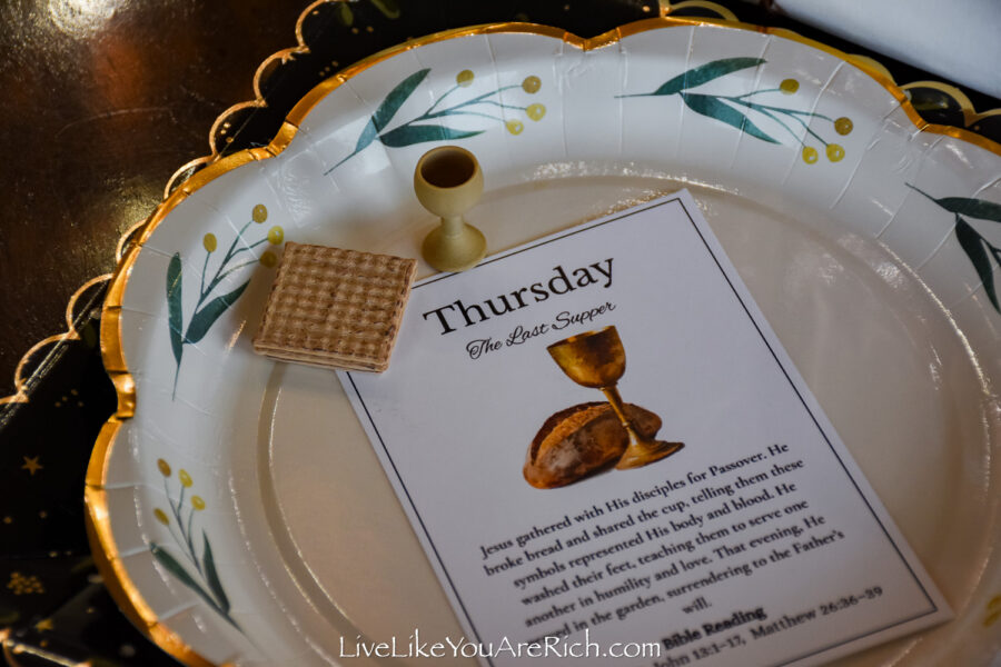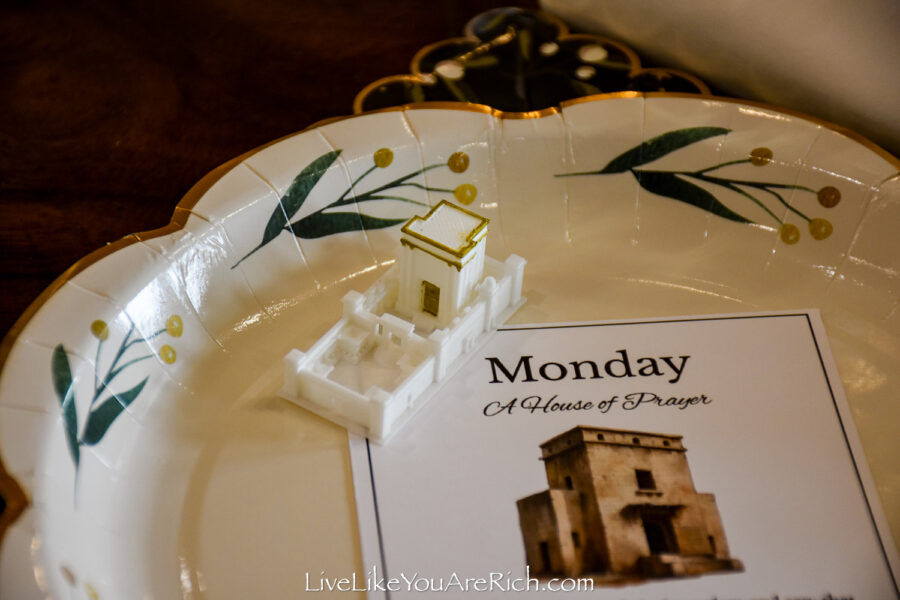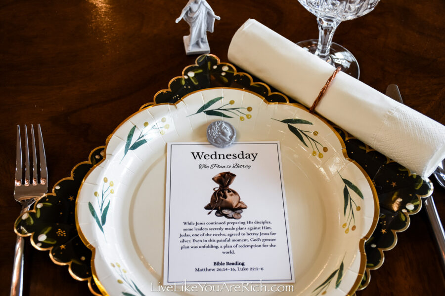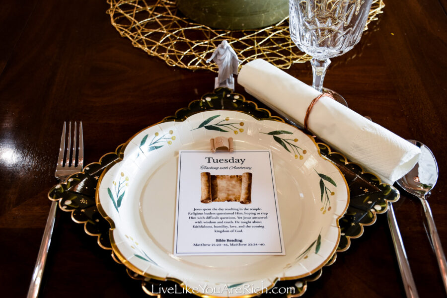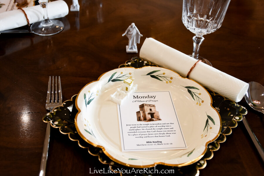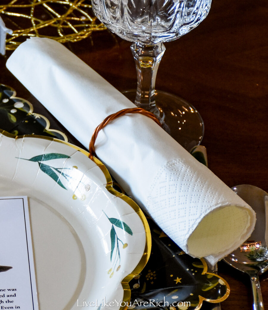 I used copper napkin rings my husband and I made to place white napkins in them and they looked like a scroll (matching Tuesday’s day of Christ’s instruction).