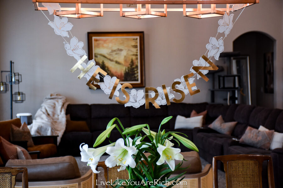 I found a darling double banner with “He Is Risen” on one strand and with lilies on the other and bought it. I was going to put it on our mantel…