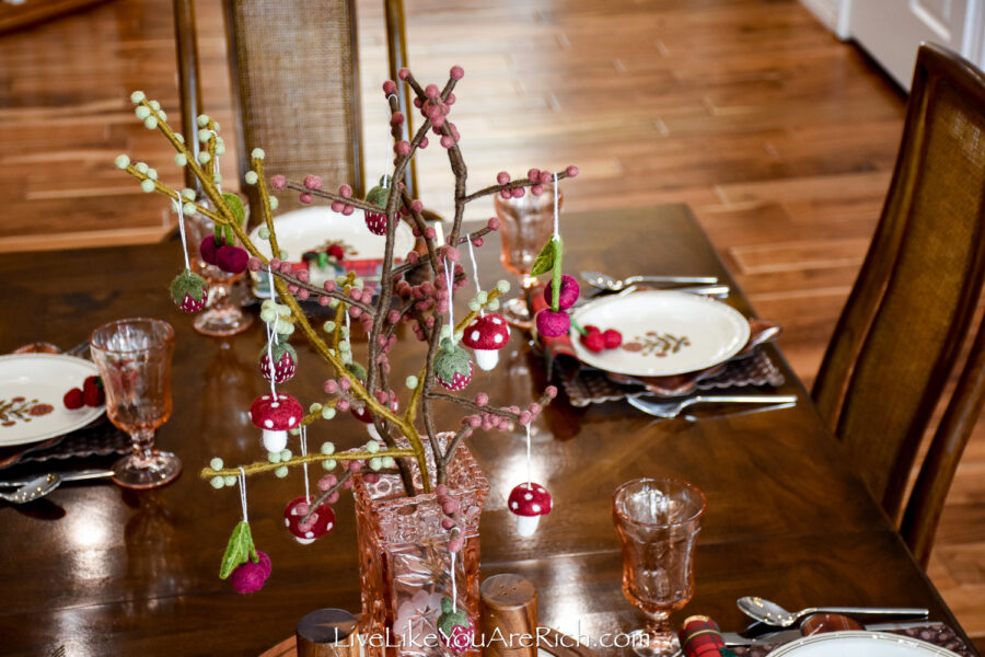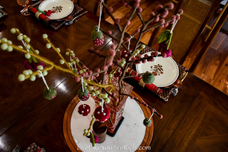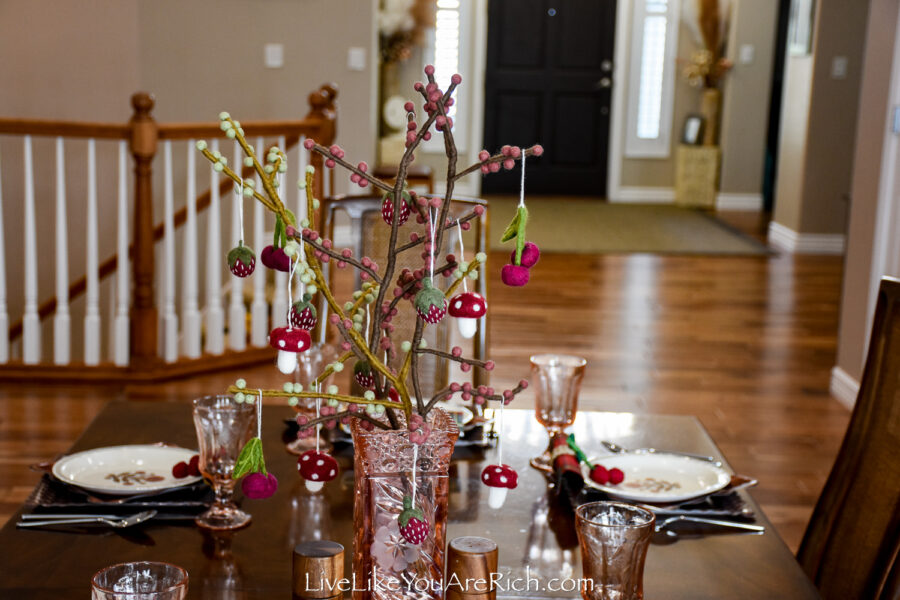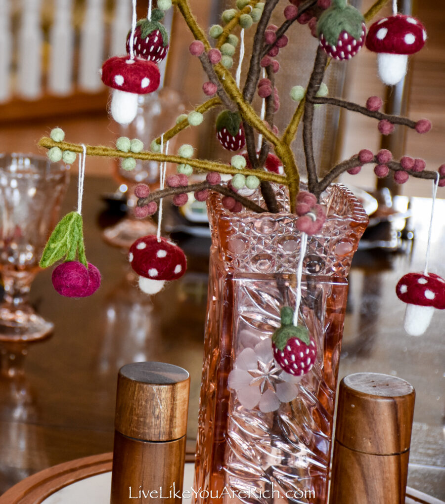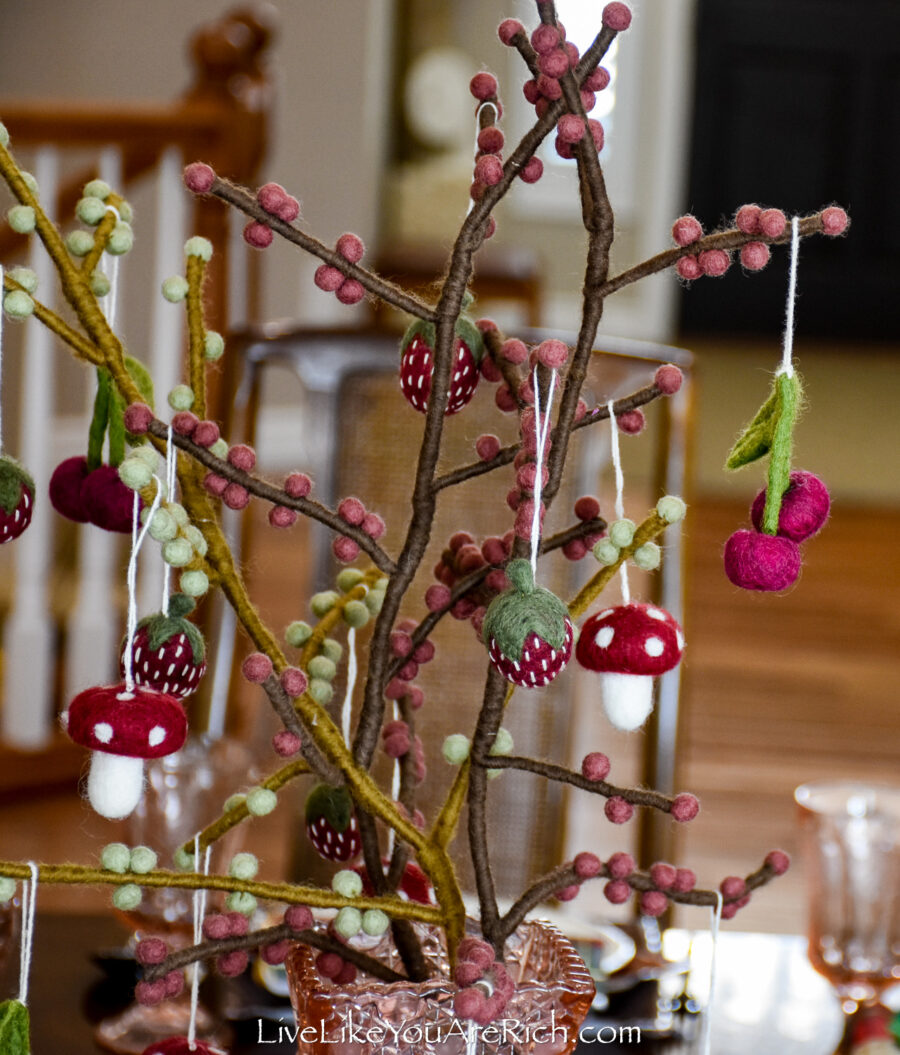 Centerpiece Felt handmade branches (x3) with cherries (x4), mushrooms (x4), strawberries (x5) Gry and Sif brand found at a shop in Norway in Nordfjordied.