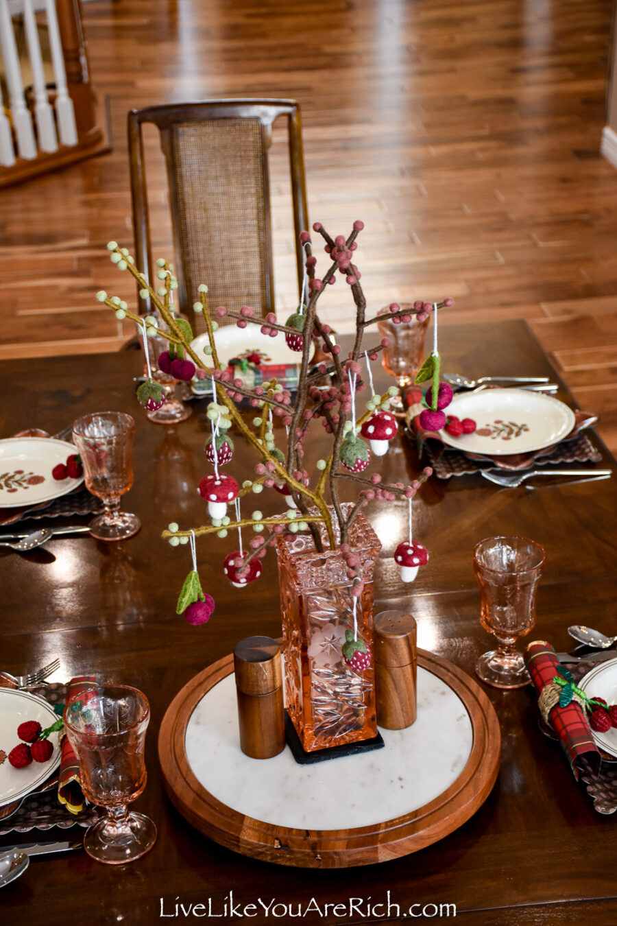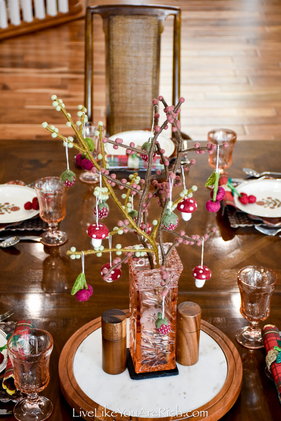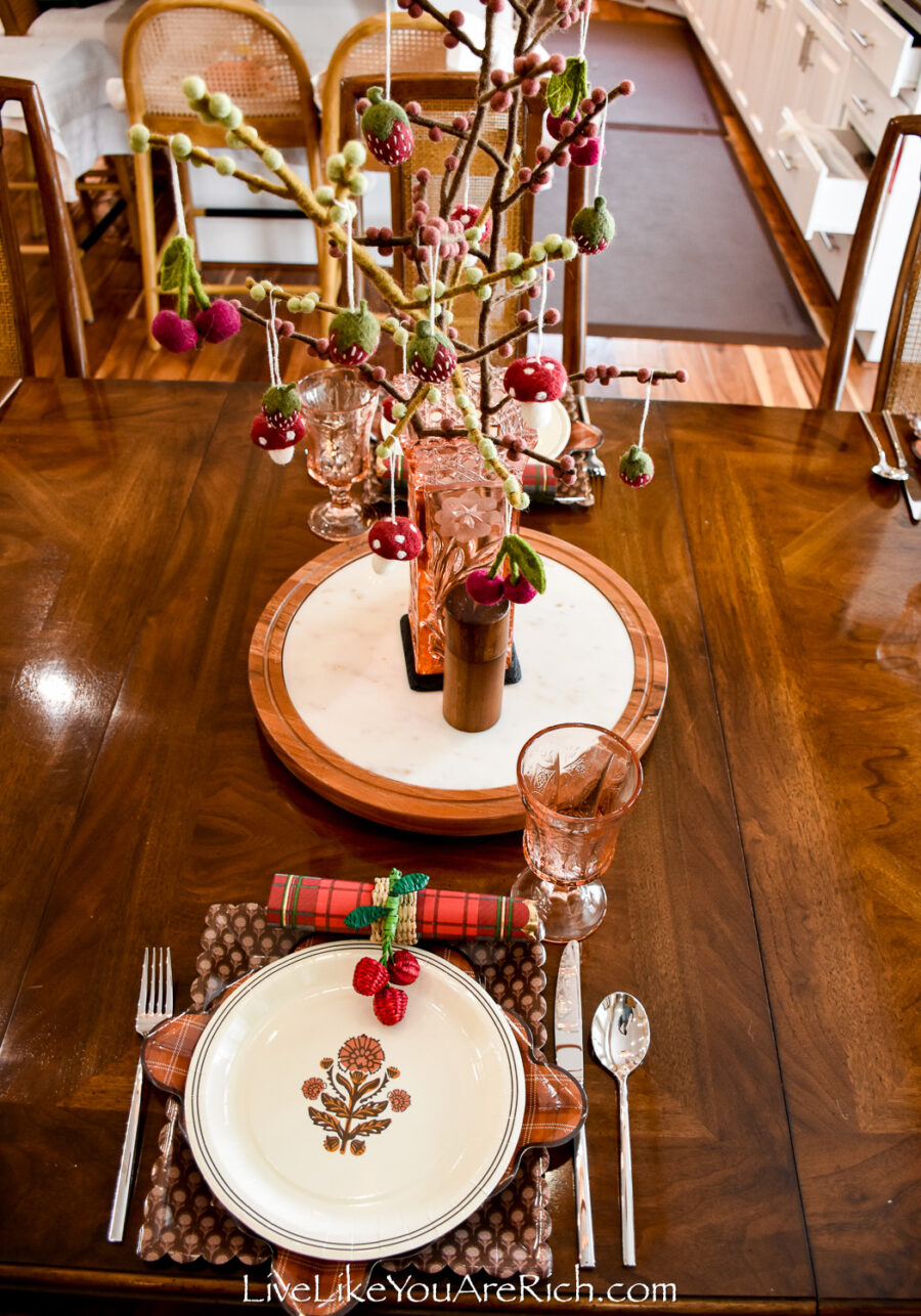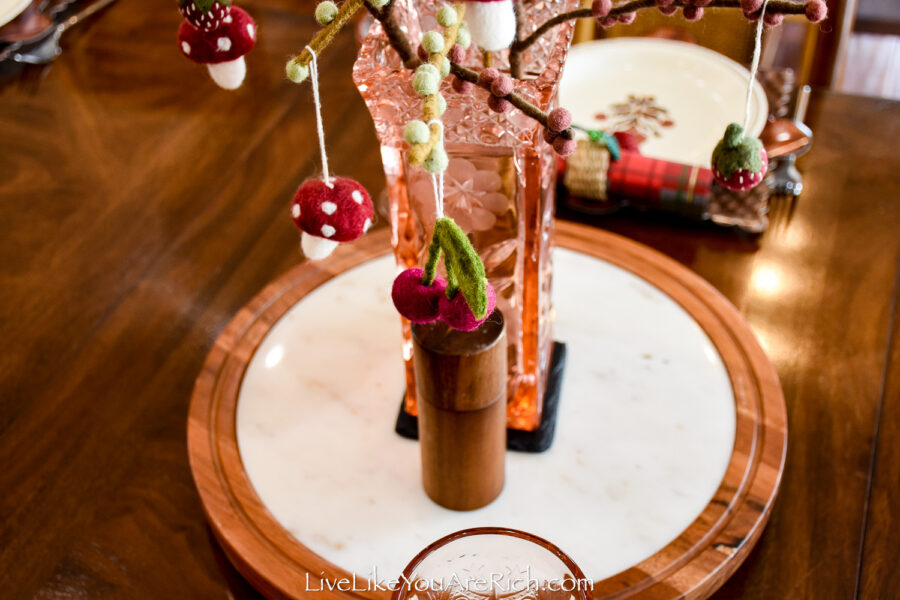 Centerpiece Felt handmade branches (x3) with cherries (x4), mushrooms (x4), strawberries (x5) Gry and Sif brand found at a shop in Norway in Nordfjordied.